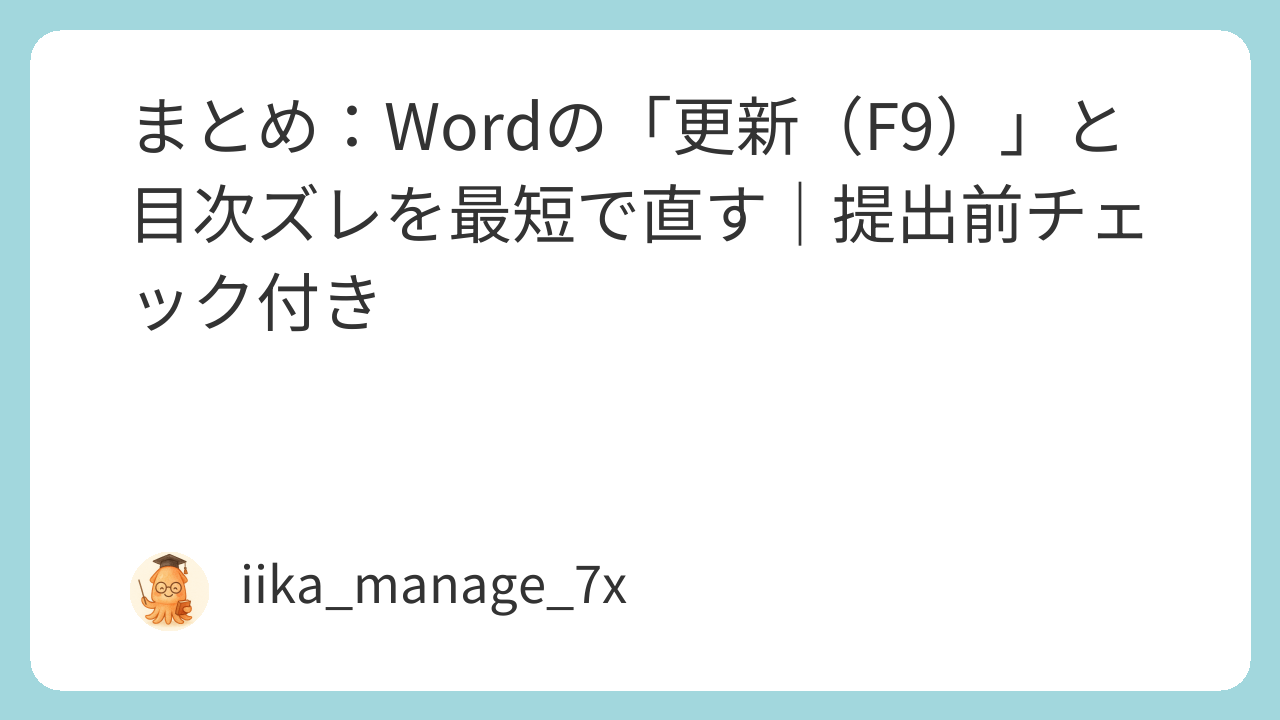https://terakoya-iika.com/pc/2025/12/26/34/ - 記事③:Wordの目次がズレたらまずこれ|更新の型(Ctrl+A→F9)+提出前チェック