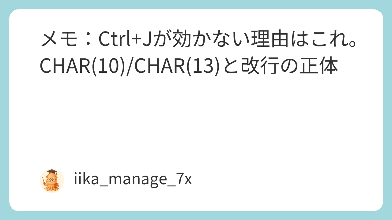 CHAR(10) と CHAR(13) は “文字コード(制御文字)の番号”で、改行の正体(LF/CR)。だから Ctrl+J が効かない時は CR/LF混在を疑う。