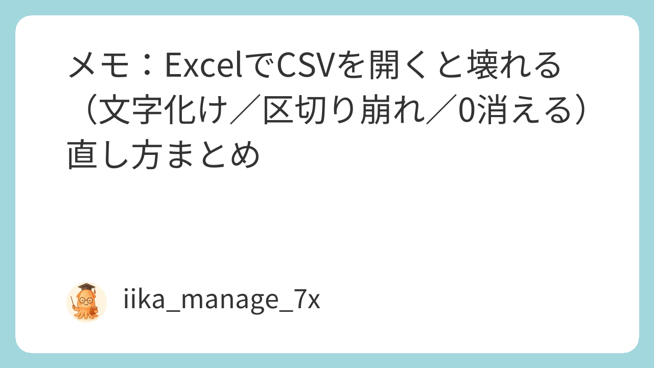 ExcelでCSVを開いたときに起きがちな「文字化け」「列がズレる」「先頭0が消える」「日付が変になる」「指数表記になる」を直すメモです。