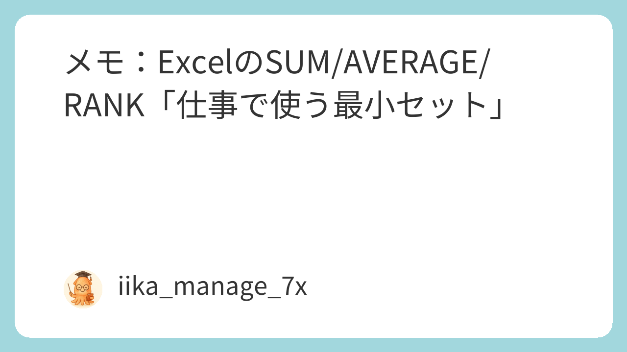 まずは SUM(合計)・AVERAGE(平均)・RANK(順位)の3つ。次に “条件付き” の SUMIFS / AVERAGEIFS。これで集計の大半が回ります。