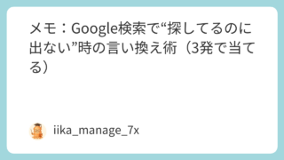 Google検索 メモ:Google検索で“探してるのに出ない”時の言い換え術(3発で当てる) こんにちは。いーかです。「絶対あるはずなのに出ない」は、検索が苦手というより 言葉がズレてることが多いです。だから、根性でページをめくるより 言い換えの型で当てにいく。30秒まとめ(結論1行+まず試す1手)結論:出ない時は ①症状を言い換え... 2025.12.29 Google検索おうちパソコン教室
