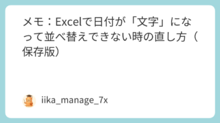 こんにちは。いーかです。Excelで「日付のはずなのにグループ化できない」「並べ替えが日付順にならない」を直すメモです。30秒まとめ(結論1行)日付グループ化できないのは、日付列に“日付じゃないもの(文字/空白/汚れ/ロケール違い)”が混ざ...