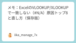 こんにちは。いーかです。Excelで「VLOOKUP/XLOOKUPが一致しない」「#N/Aになる」問題を、原因別に最短で直すメモです。30秒まとめ(結論1行)一致しない原因はだいたい①型違い(文字/数値/日付)②不可視空白(NBSP)③全...