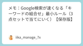 こんにちは。いーかです。"ダブルクォート" は、ハマると一気に探せます。ハマらないと何も出ません。効く場面だけ押さえます。30秒まとめ(結論1行)" " は「この文字列をこの順番のまま探す」。エラー文・固有名詞・文章の一部に刺さる。効く場面...