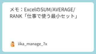 こんにちは。いーかです。Excelで「集計って結局どれ覚えればいいの?」を、仕事で使う範囲だけに絞ったメモです。30秒まとめ(結論1行)まずは SUM(合計)・AVERAGE(平均)・RANK(順位)の3つ。次に “条件付き” の SUMI...